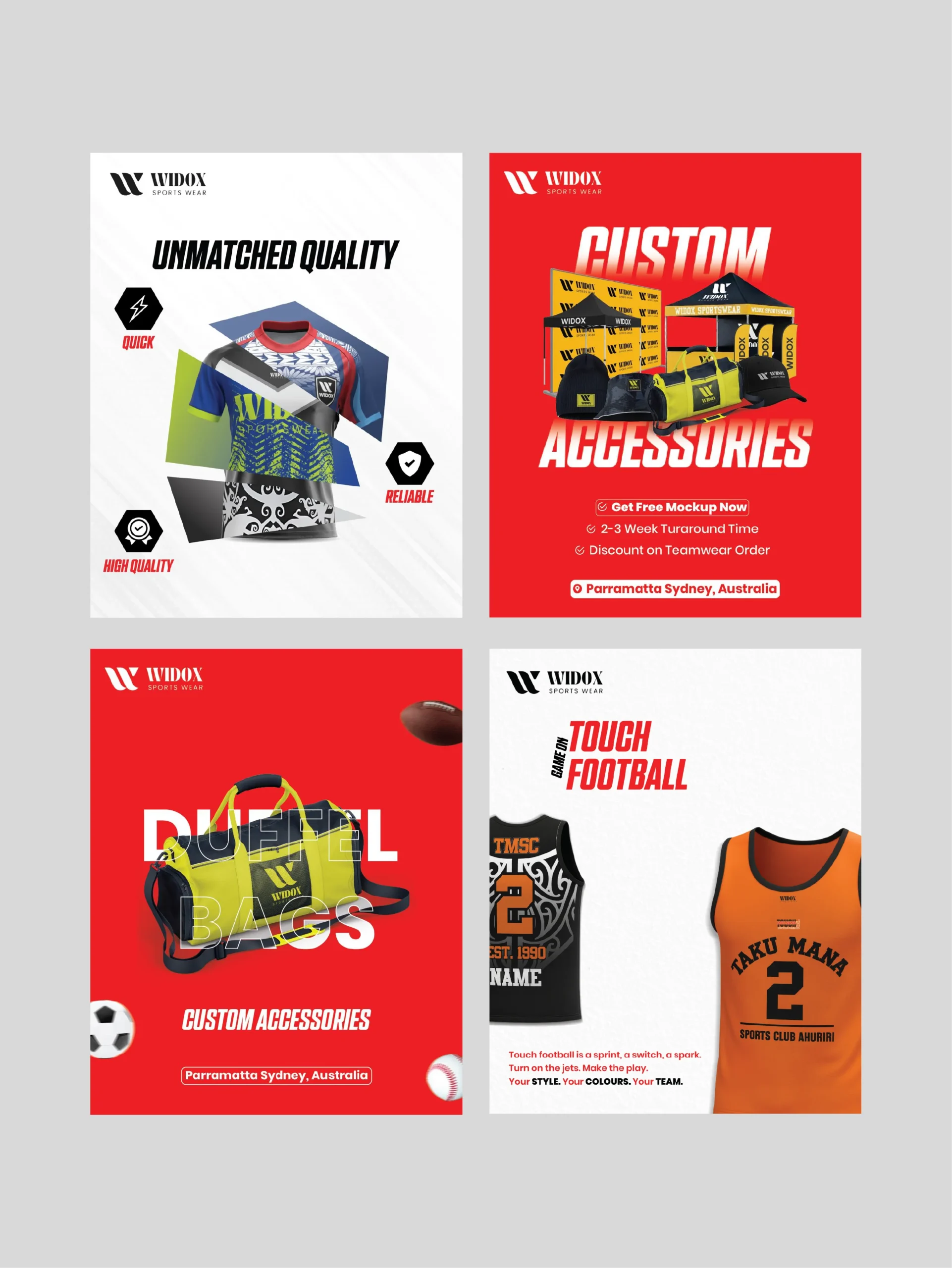 Widox Sports Wear is an Australian sportswear brand that needed a strong, modern identity to stand out in the B2B market. We developed a confident visual system focused on durability and excellence — ensuring their brand speaks to teams and clubs looking for premium athletic apparel.